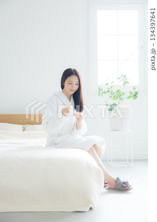Two asian women are sitting relax on a bed in white robe and towel wrapped around their head, spreading body lotion cream gel after showering and taking bath