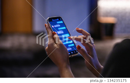 一隻女人的手正在智慧型手機上操作聊天軟體。