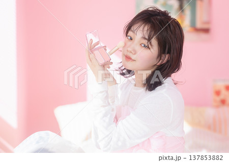 年輕的亞洲女性用腮紅刷和麵刷化妝