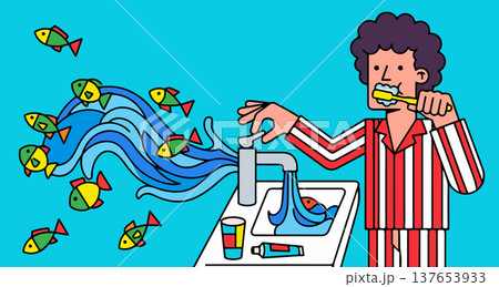 Man Brushing Teeth with Fish and Water