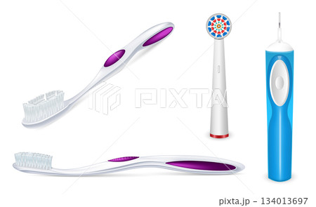 Oral hygiene, cleaning tools set. Different dental care accessories. Electric toothbrush, tooth brush, toothpaste tube, oral irrigator, floss. Braces teeth. Flat isolated vector illustration