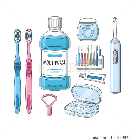 Oral irrigator, toothbrush, mouthwash, interdental brush, retainer, floss and other dentistry items set. Dental care, health, hygiene concept. illustration design