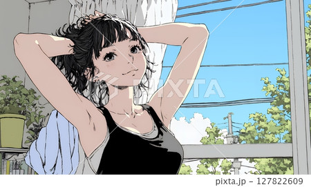 穿著睡衣的日本女人放鬆的動漫風格藝術 穿著睡衣的日本女人放鬆的動漫風格藝術