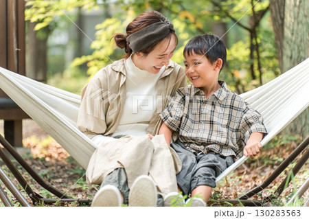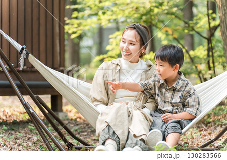 一家人/家人在露營地的吊床上玩耍(戶外/旅遊/休閒/野餐)