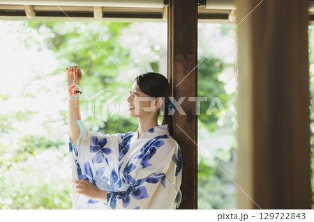 一個穿著浴衣的女人在門廊上拿著風鈴