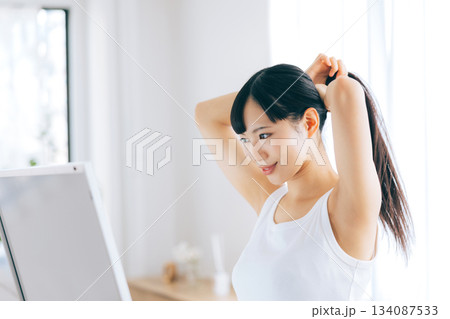 一位年輕女子一邊綁頭髮,一邊嘴裡叼著牙刷。