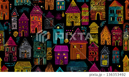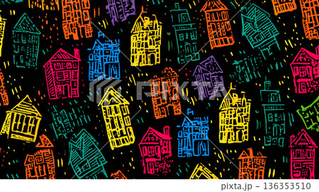 A playful, seamless pattern of stylized house doodles in bright pink, yellow, blue, and green, rendered in a chalk-like texture against a solid black background.