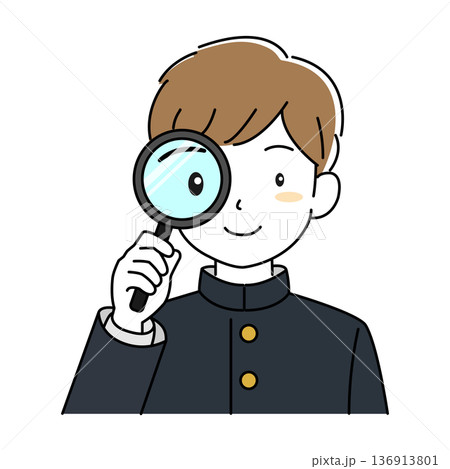 一名身穿制服的高中男生用放大鏡發現了什麼東西,臉上露出驚訝的表情。