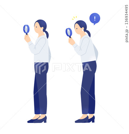 一組材料描繪了一位女商務人士用放大鏡「尋找」和「發現」的過程,表達了調查、確認和發現的過程。