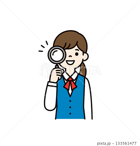一幅簡單的上半身向量插圖,描繪了一位身穿制服的年輕女子正在透過放大鏡觀察和分析。