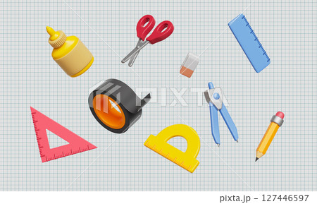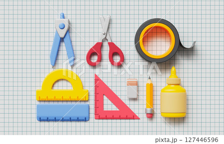 Stationery Set of School and Office Supplies. 3D Rendering.