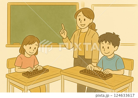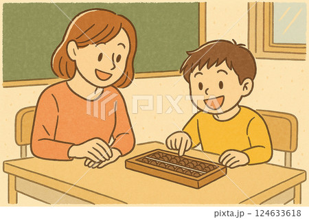 學習算盤的小學生和他們的老師的插圖(教室,課堂場景,水彩風格)