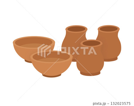 Ceramic clay, wooden and glass pottery bowl hand drawn in watercolor for hobby storage, kitchen restaurant food. Illustration isolated object on white. Earthenware artisan craft, handmade product
