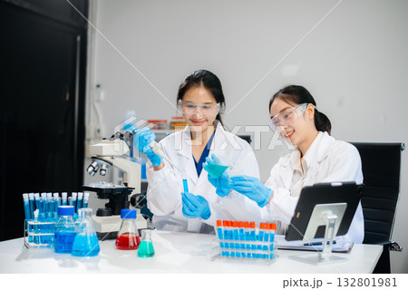 Young scientists conducting research investigations in a medical laboratory, a researcher in the foreground is using a microscope in laboratory for medicine.