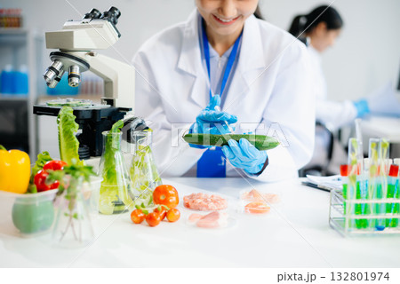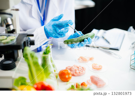 Food science as lab scientists test and analyze vegetables for safety and quality using advanced technology