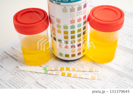 Urinalysis, urine cup with reagent strip pH paper test and comparison chart in laboratory.