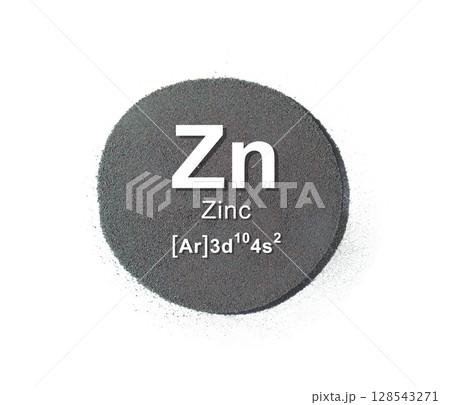 Chemical ingredient on white laboratory table. Zinc Powder with Symbol, Name and Electron Configuration.