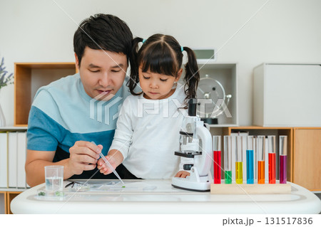 toddler girl scientist using pipette dropping of liquid being placed on glass slide with her father, preparing specimen for science microscope