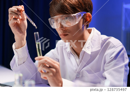 Scientist adult hands conduct chemical experiment with test tubes professional laboratory research medical analysis developing innovation scientific discovery
