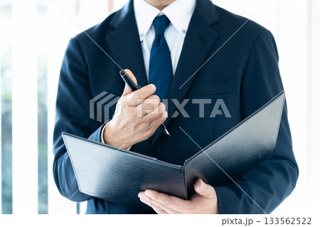 一位身穿西裝、手拿黑色文件的中年男性商人