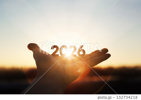 Bright sunlight shining through hands and sunrise background for New Year 2026