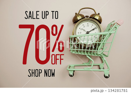 Sale 70% off Shop Now text with alarm clock and trolley shopping cart on pink background