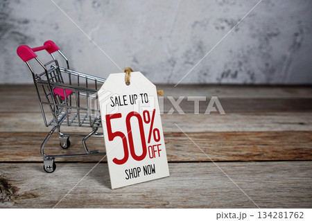 Symbol of a shopping cart with a super sale up to 50% text and text of 11.11 sale on the label tag. Copy space. Flash sale concept