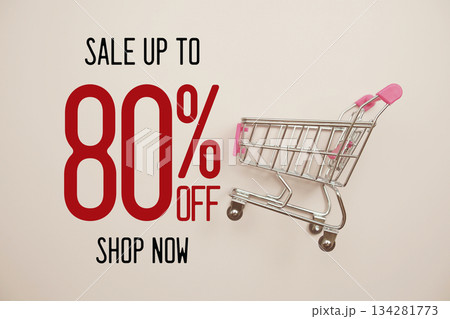 Sale 80% off Shop Now text with trolley shopping cart on wooden background
