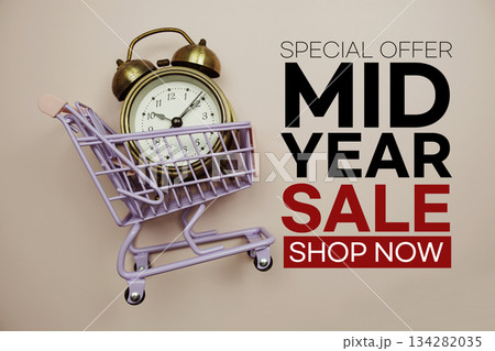Mid Year Big Sale Shop Now Special Offer text on paper card with alarm clock and trolley shopping cart on wooden background