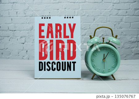 Early Bird Discount text Promotion and Marketing with alarm clock on wooden background
