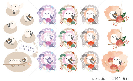 新年裝飾花圈和長尾山雀日式圖示套裝(新年卡片、冬至卡)