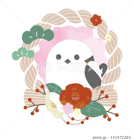 灰色注連繩、側身站立的長尾山雀和日式山茶花環(新年裝飾)