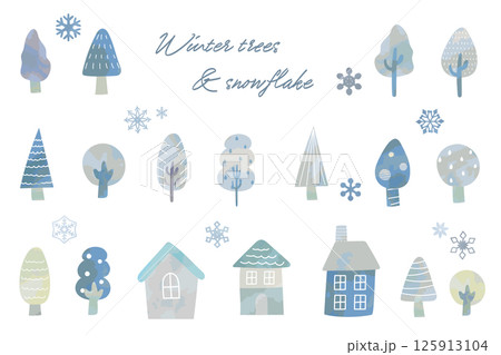 斯堪的納維亞風格的冬季樹木和房屋插圖集,水彩畫風格