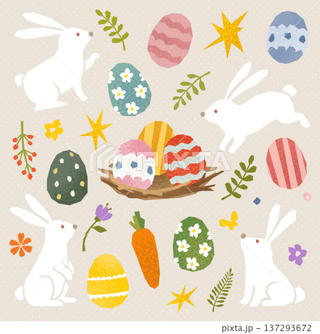 Easter bunny and decorated egg illustration set in cute paper cut collage style with spring flowers and carrots