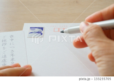 用毛筆在新年賀卡道歉明信片上寫下地址