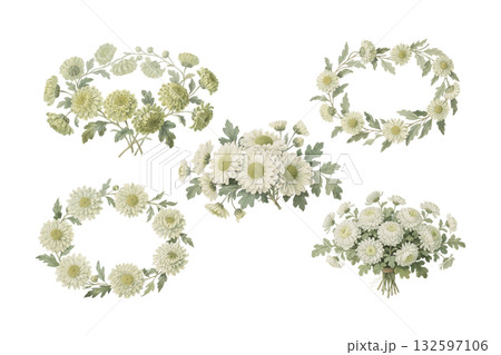 水彩復古風格白色菊花插畫組(5幅)AI格式