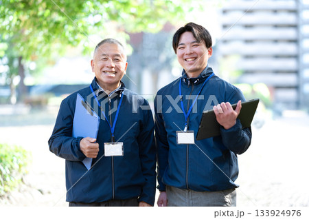 一位身穿綠色工作服、手持活頁夾和筆的中年男性商人