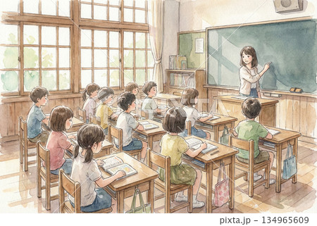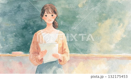 黑板前方拿著手稿的女人,教室風景,水彩插圖