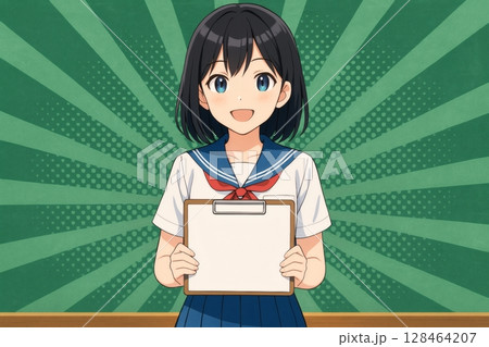 簡單而時尚的線條畫,畫中一名高中女生指著黑板