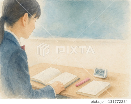 過肩鏡頭下準備考試的場景(高中女生/筆記本和計時器)