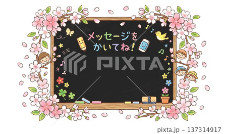 一個以黑板為背景,周圍散落著櫻花的留言框