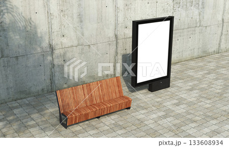 Blank Digital Billboard Mock up with Wooden Bench on Street. 3D Rendering.