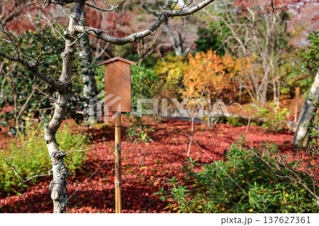 Empty retro wooden billboard in the autumn park. Signboard made of wood with space for text and graphics.