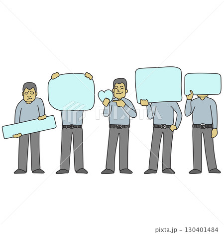 set of man holding blank sign illustration vector hand drawn with black lines isolated on white background.
