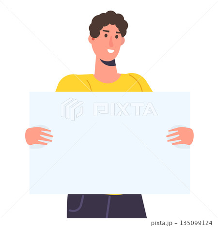 Smiling man holding empty banner. Vector isolated illustration
