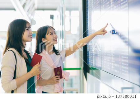兩名女子正在觀看機場的電子顯示器。 (圖片由關西國際機場(KIX)提供)
