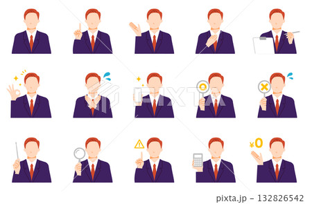 插圖集:一位身穿西裝的男士透過臉部表情和姿勢表達情緒