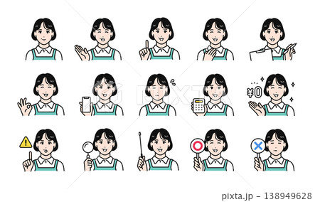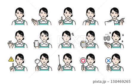一組以商務為主題的臉部表情圖標,人物為穿著圍裙的中年女性員工。