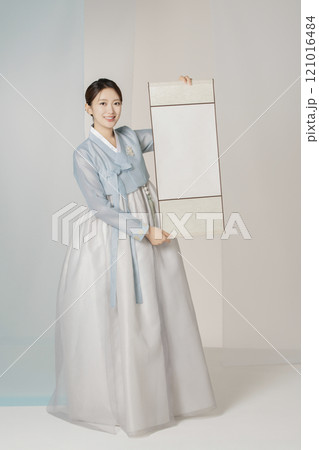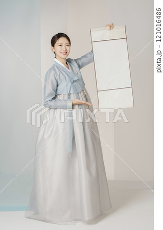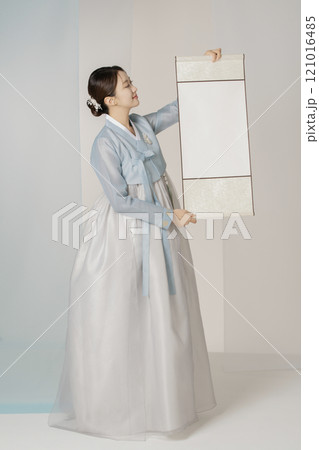 A beautiful woman wearing an elegant Hanbok and holding a traditional scroll scroll.
