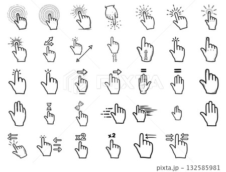 Collection of hand drawn user interface gestures like click, tap, swipe, and drag for touchscreen interaction